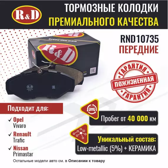 Тормозные колодки R&D передние RND10735 OPEL VIVARO A/ Опель Виваро, RENAULT TRAFIC III/ Рено Трафик, NISSAN PRIMASTAR/ Ниссан Примастар