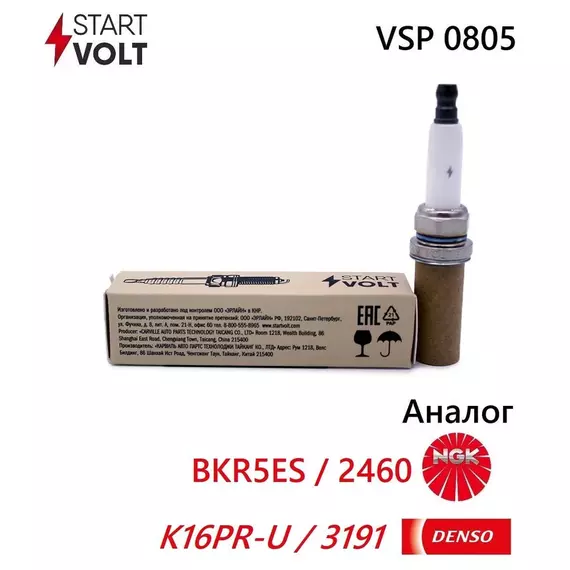 Свеча зажигания, 1 шт. STARTVOLT VSP 0805 (аналог DENSO K16PR-U / 3191 и NGK BKR5ES / 2460) для HYUNDAI Accent Тагаз / SSANGYONG Musso, Korando, Chairman / SKODA Felicia / PEUGEOT 106, 206 / MITSUBISHI Space Runner / MERCEDES W202, W208, W463